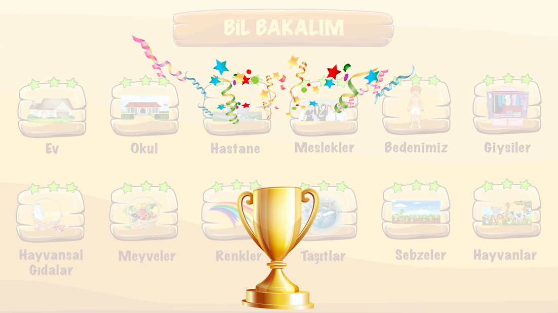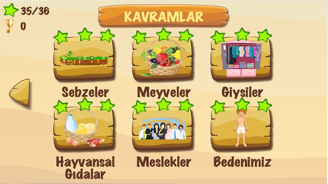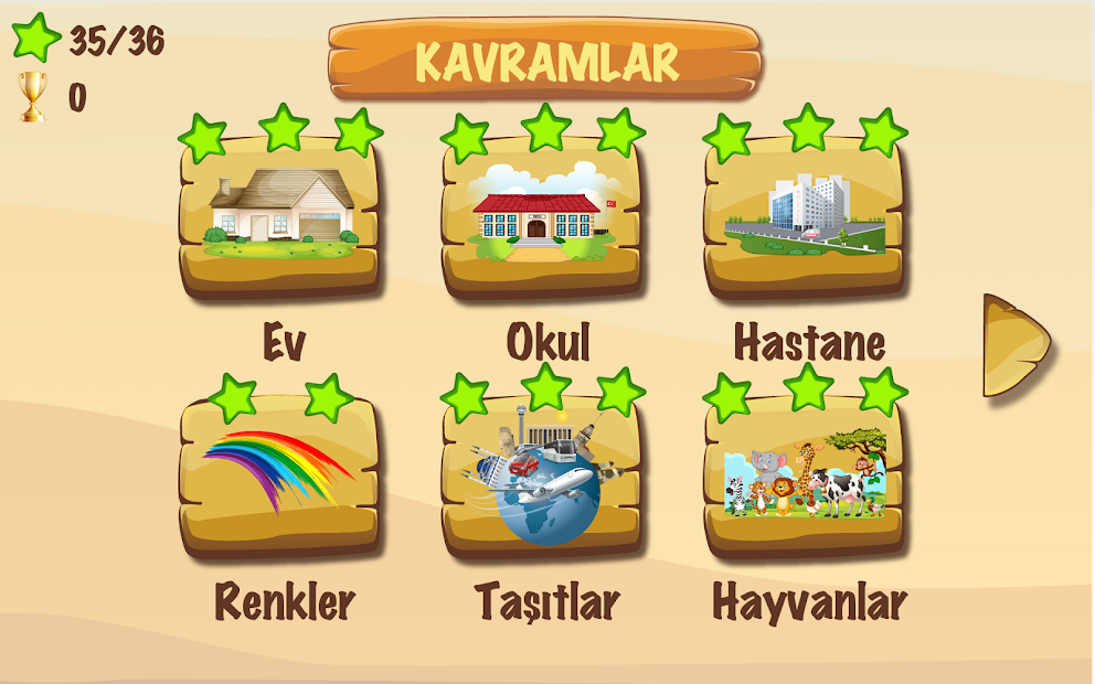 İlkokul çağındaki çocukların günlük yaşamda sık karşılaşacakları kavram ve kelimelerden oluşmaktadır. Ana kavram alanıyla eşleştirilen alt kavramdan oluşan bir çok sözcükle tasarlanan bu oyunla, çocuklarımızın Türkçe öğrenimi ana hedefimiz olurken aynı zamanda eğlenmeleri de pedagojik bağlamda göz önünde bulundurulmuştur.