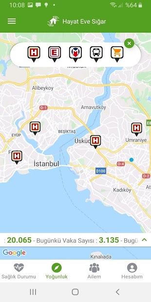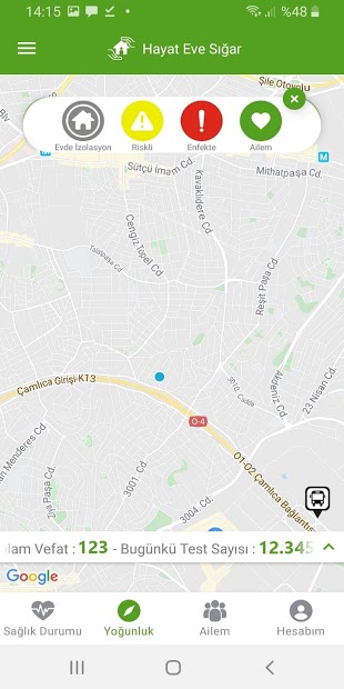 Aynı zamanda harita üzerinde hastane, eczane, market zincirleri, metro ve duraklar gibi temel ihtiyaç noktalarına kolayca ulaşabilir, evde izolasyon, enfekte kişiler ve riskli bölgelerin yoğunluğunu görebilirsiniz.
