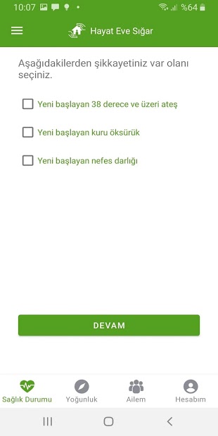 T.C. Sağlık Bakanlığı tarafından vatandaşlara sunulan Hayat Eve Sığar uygulaması ile telefon numaranız ile doğrulama yaparak adım adım size sorulan soruları cevaplayıp, koronavirüs hastalığı anlamında vermiş olduğunuz şikayetlerinize göre değerlendirilerek nasıl davranmanız gerektiğine göre yönlendirme alabilirsiniz. Vermiş olduğunuz cevaplara göre yönlendirmeler sadece öneri niteliği taşımaktadır ve nihai bir sonuç/kesinlik içermemektedir, tavsiye niteliğindedir.